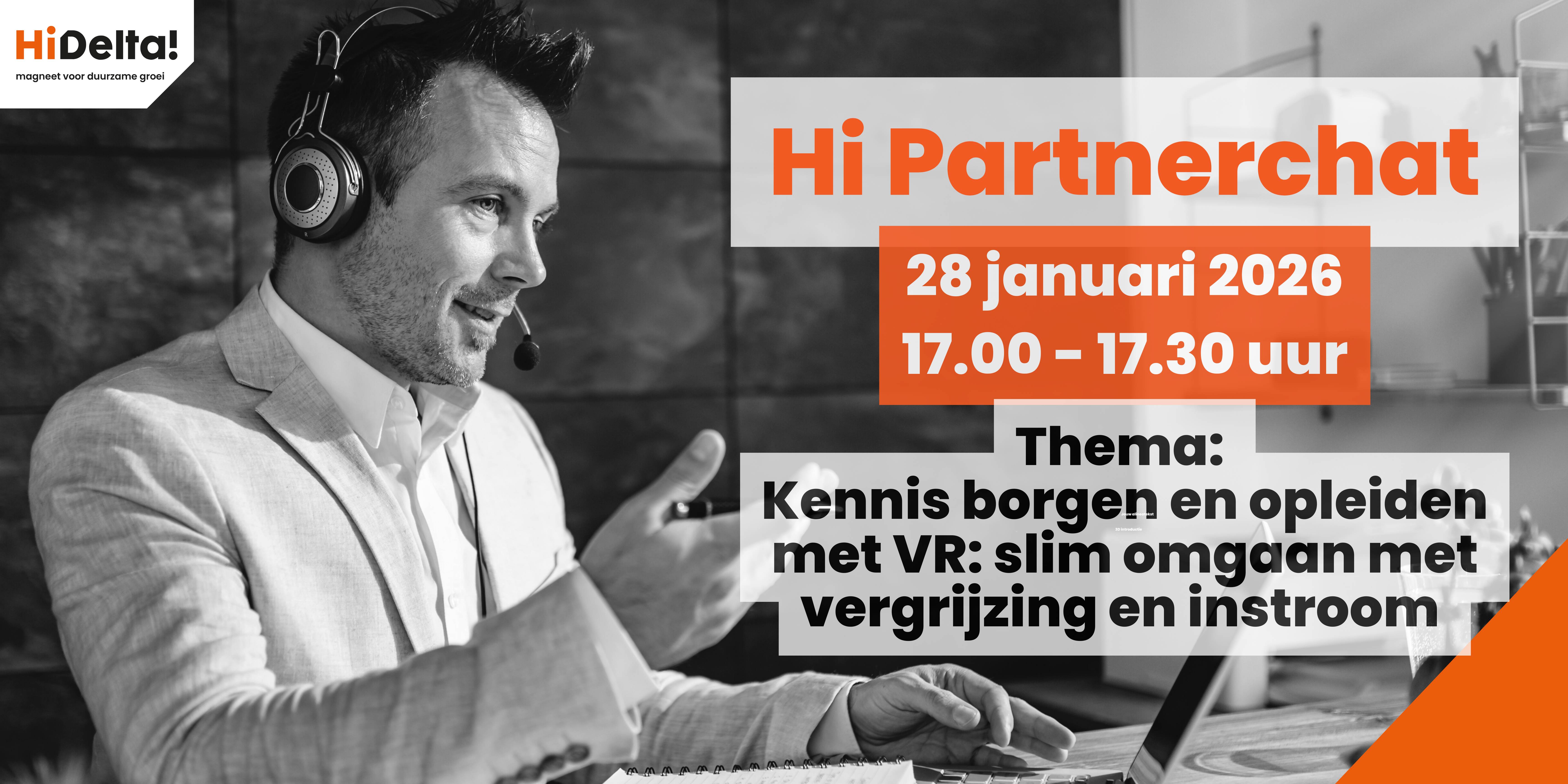Op 28 januari van 17:00-17:30 uur organiseren we weer een Hi Partnerchat met dit keer als thema 'Kennis borgen en opleiden met VR: slim omgaan met vergrijzing en instroom'. Ben jij partner van Hi Delta? Sluit dan aan bij onze maandelijkse Hi: een korte, interactieve online sessie waarin partners uit de technologische en maakindustrie in Zuid-Holland elkaar ontmoeten, inspireren en ervaringen uitwisselen.
